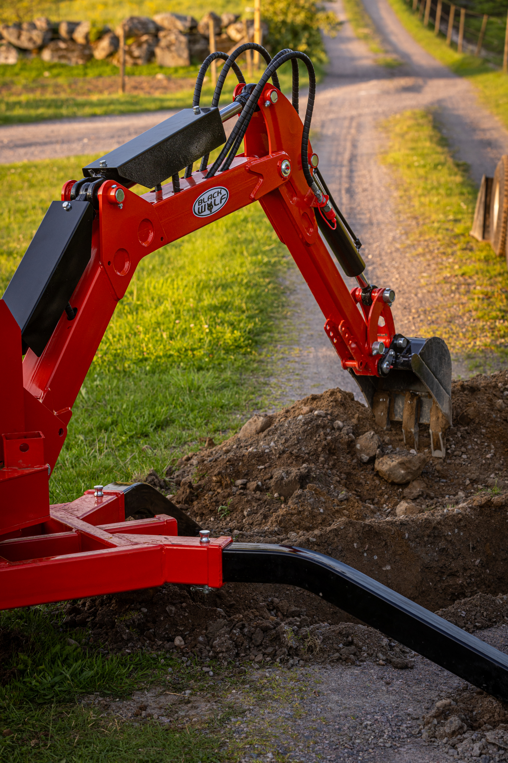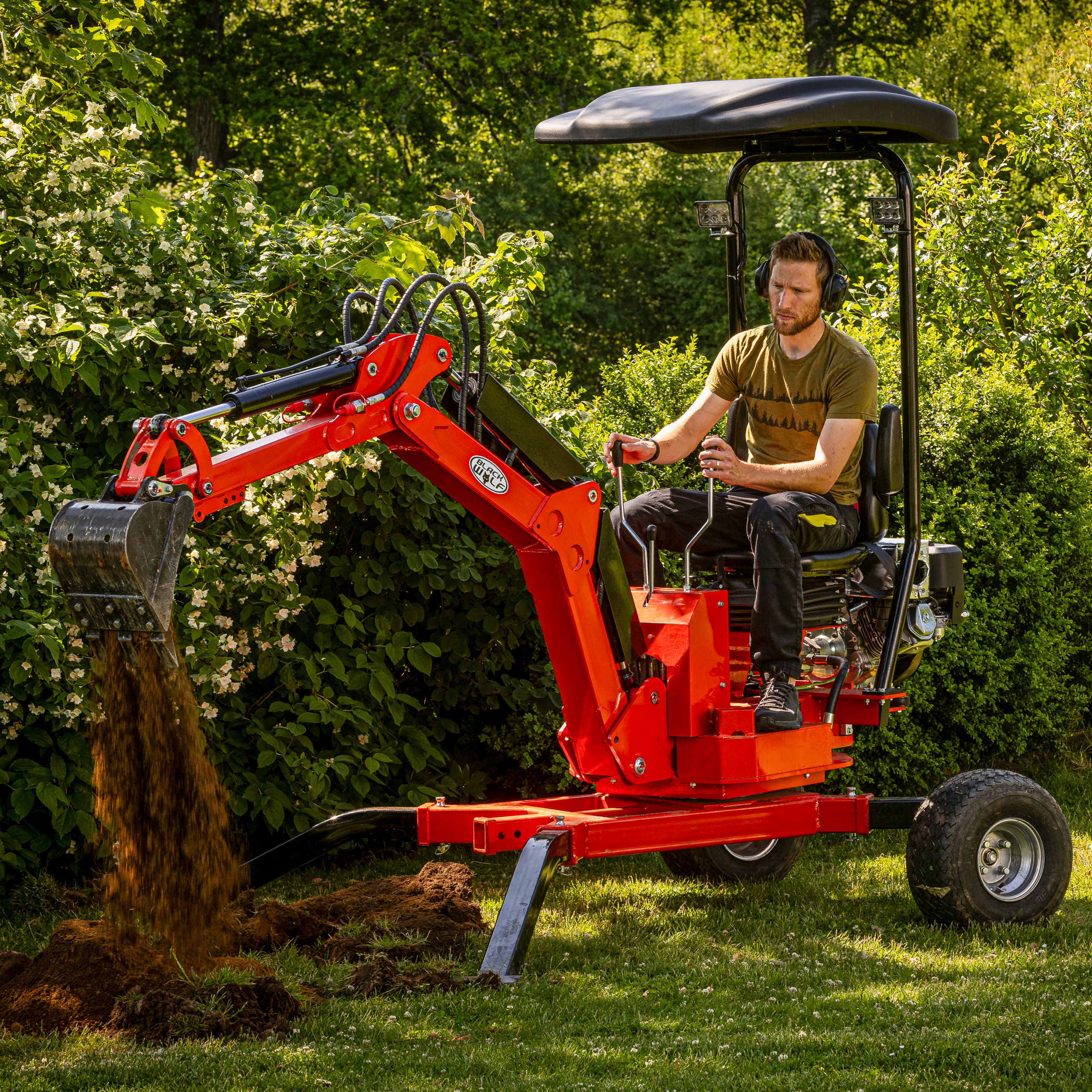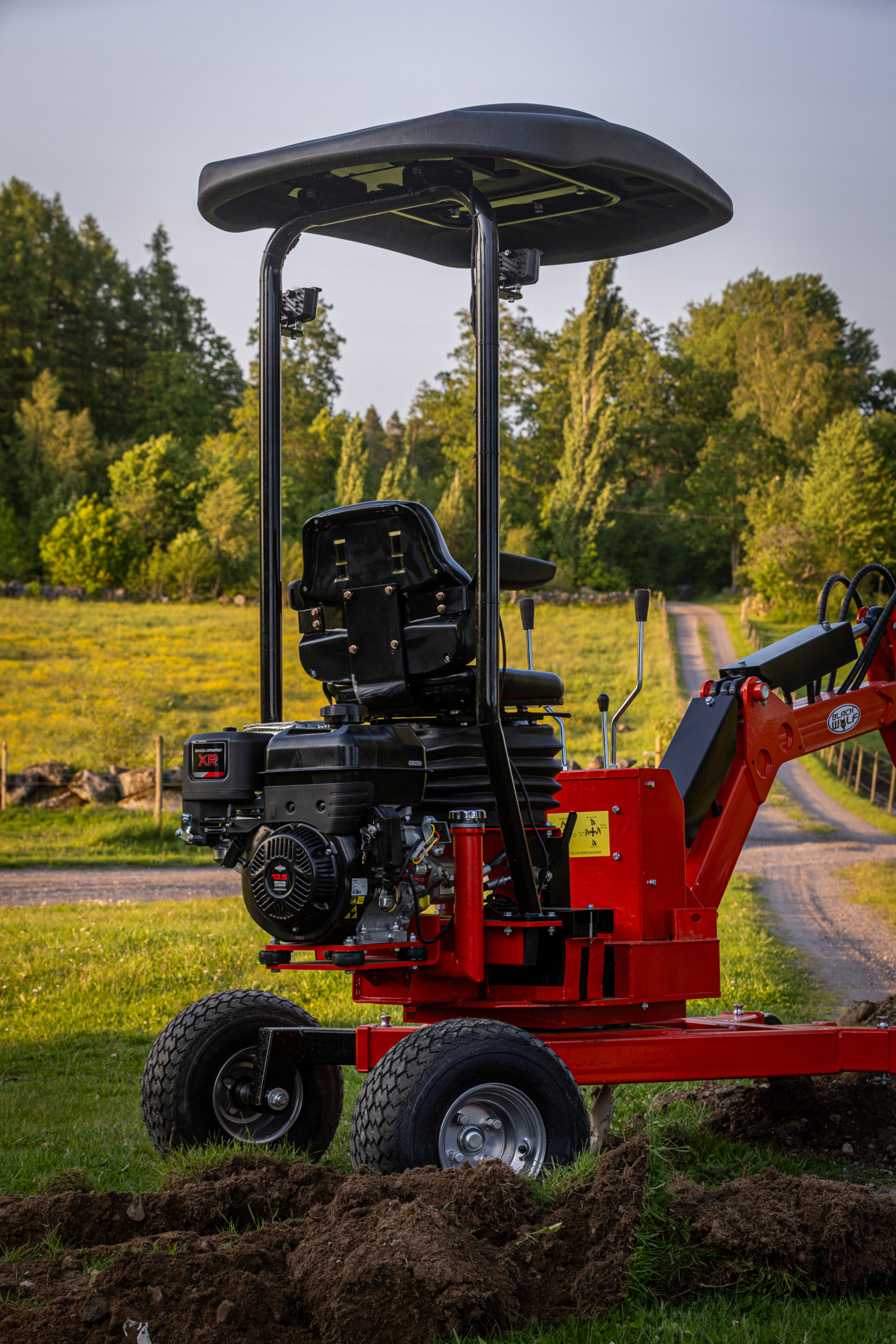 Med egen motor, elstart, arbetsbelysning, tak och stötdämpat säte är Black Wolfs kompakta grävare ett praktiskt verktyg för markjobb oavsett väder eller säsong.